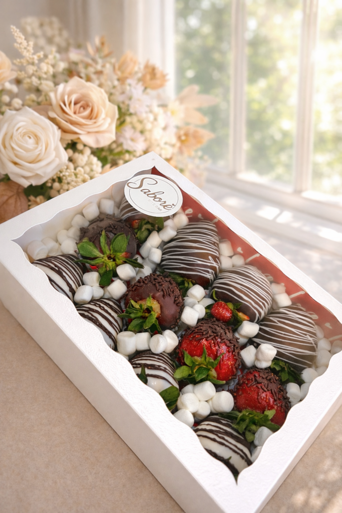 This elegant box includes 12 fresh strawberries dipped in rich dark chocolate, finished with delicate white chocolate drizzle and decorative mini marshmallows that add a sweet and charming touch.