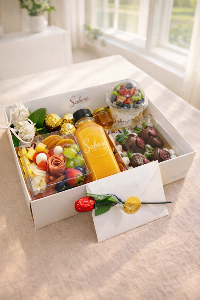 This elegant brunch-inspired box includes chocolate-covered strawberries, a fresh fruit parfait made with Greek yogurt and granola, a mini charcuterie selection with cheese and salami, Ferrero Rocher chocolates, and a refreshing natural orange juice.