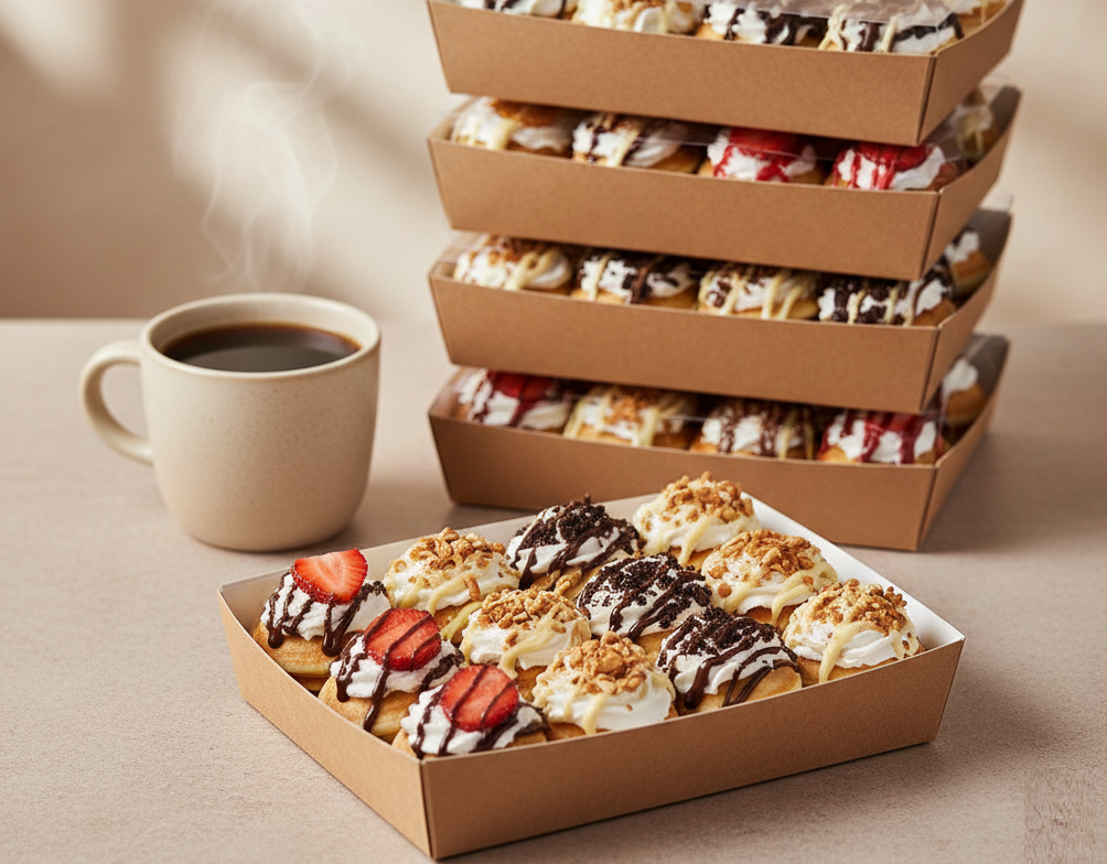 Fresh mini pancakes, carefully prepared and presented in elegant individual kraft boxes with a clear lid. Perfect for events, celebrations, corporate gifting, and special gatherings.