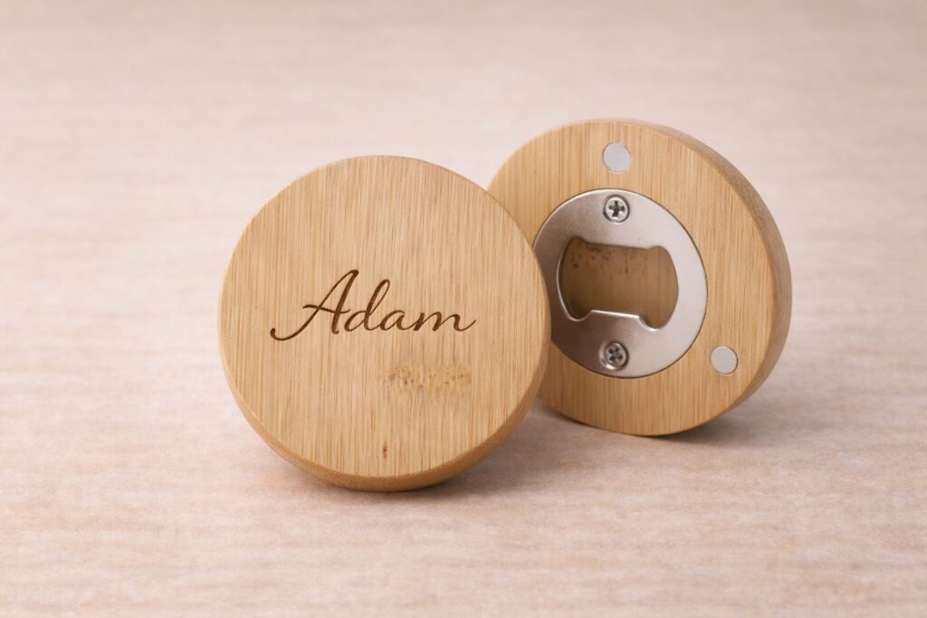 Personalized bamboo bottle openers that work as guest place markers and event keepsakes.